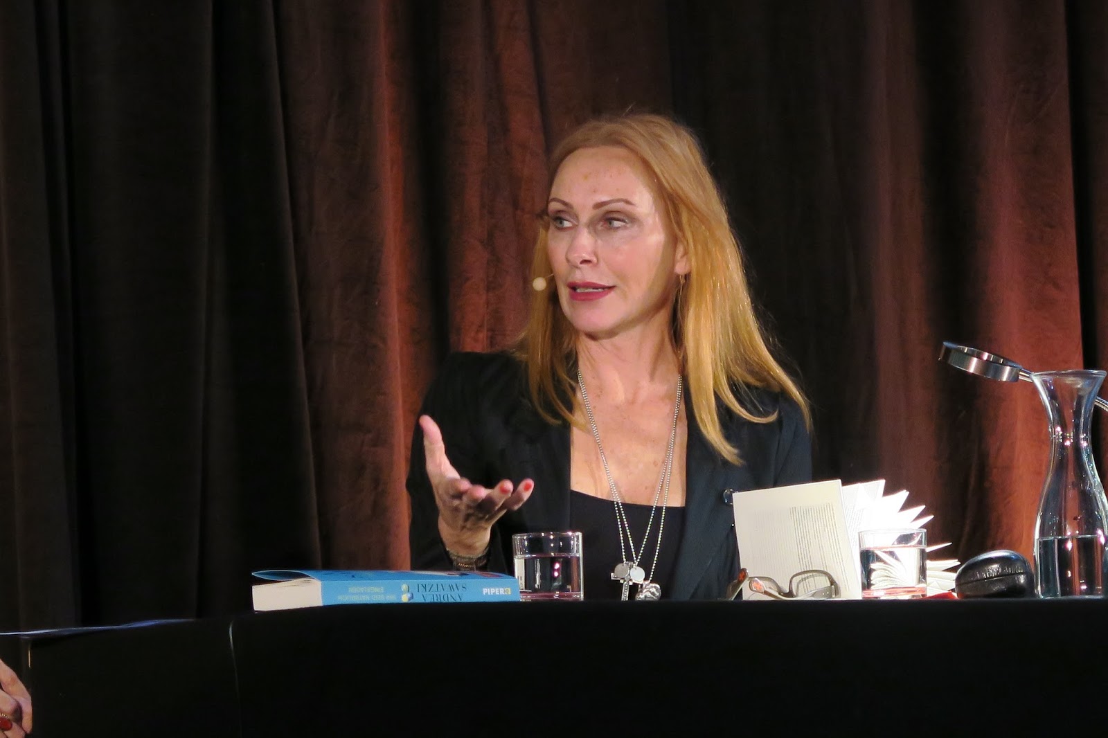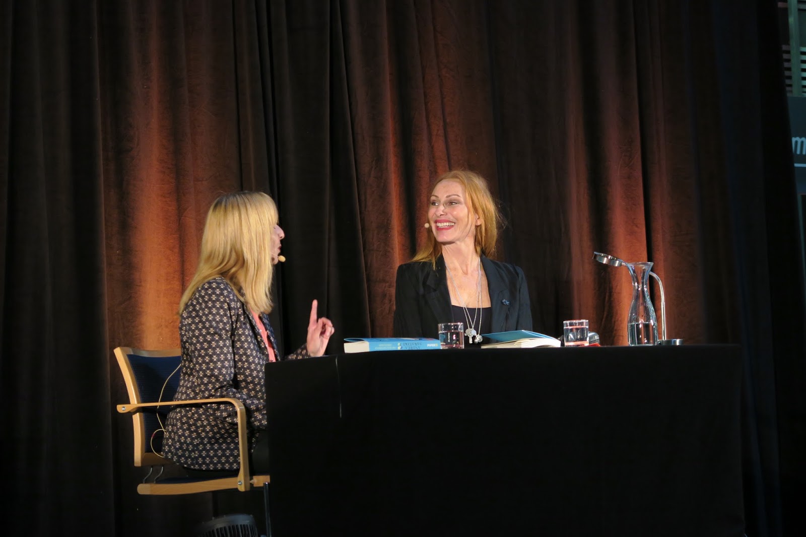 Die Autorin wich geschickt den gestellten Fragen aus. Mit dem ihr eigenen Witz umschiffte sie immer wieder die Klippen der direkten Beantwortung, was das Publikum dennoch amüsierte. Sie erzählte viel und sorgte für Lachtränen, lies sich aber gleichzeitig nicht dazu verleiten, aus dem Nähkästchen zu plaudern.