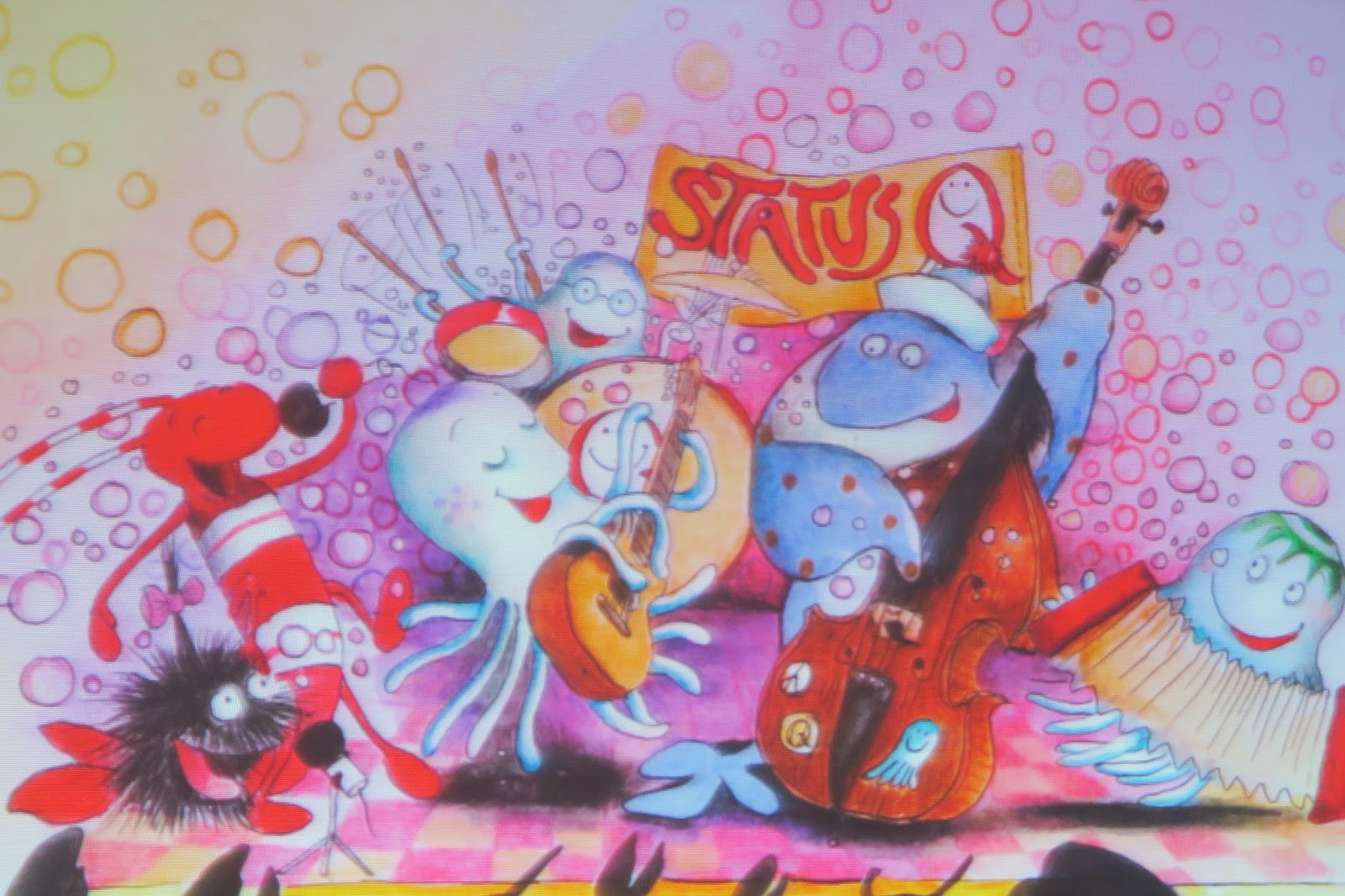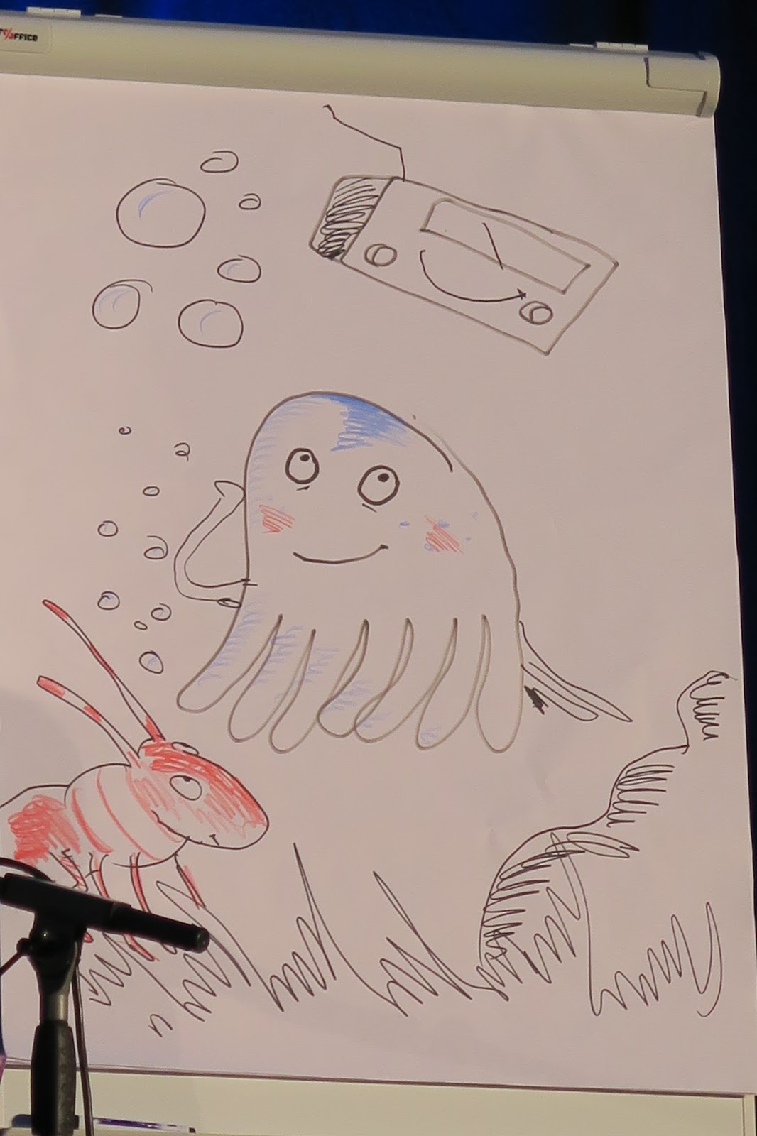 Heinz Rudolf Kunze stellte mit tatkräftiger Unterstützung von Jens Carstens und Julia Ginsbach die Familie und Freunde rund um Quentin Qualle musikalisch und unterhaltsam für Kinder und Erwachsene vor. Neben den hörspielartigen Inszenierungen, durften die Gäste das zeichnerische Talent von Julia Ginsbach live bestaunen.