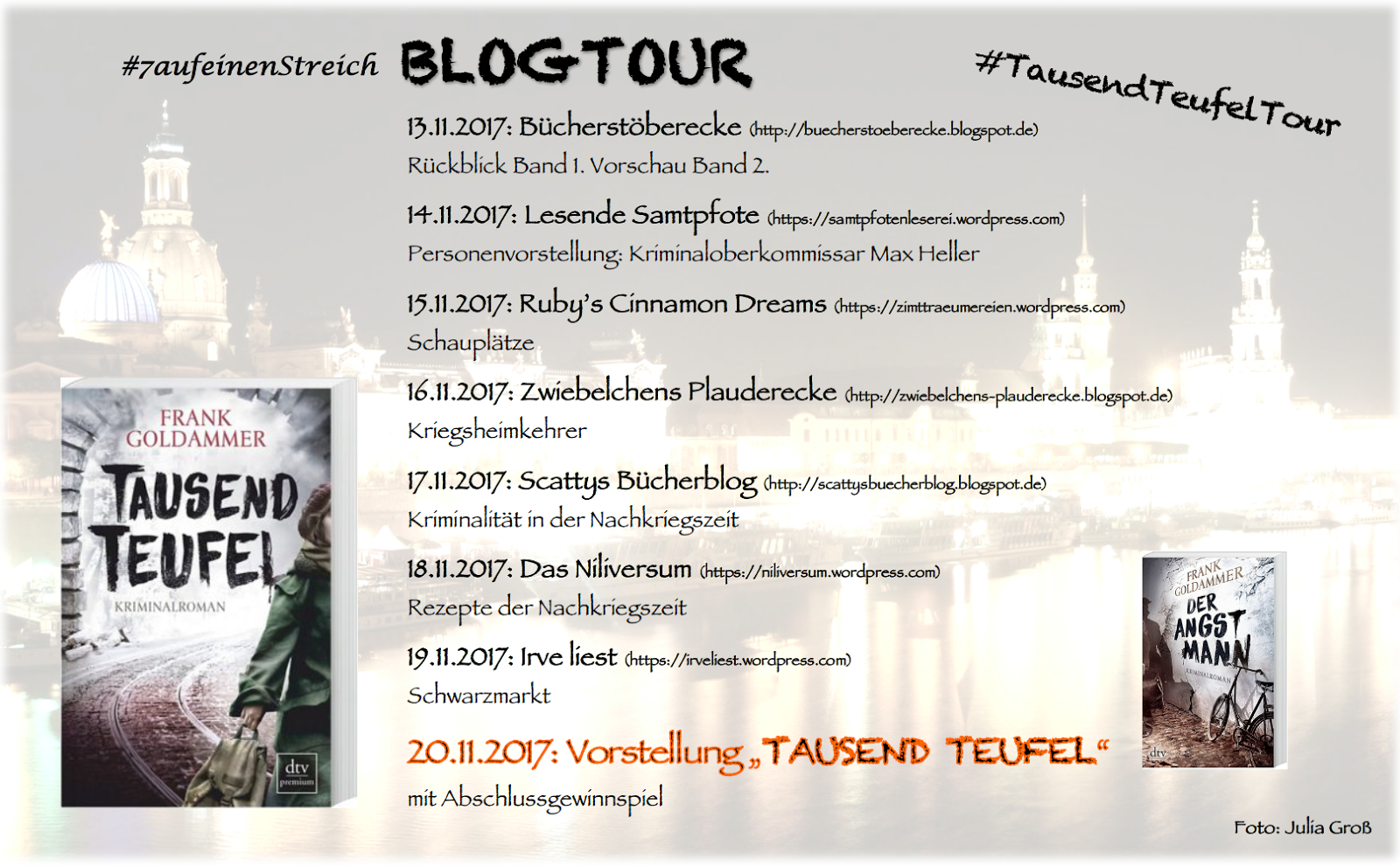 Mit Unterstützung der dtv-Verlagsgesellschaft dürft ihr euch auch auf ein Gewinnspiel freuen. Wer alle Blogtourbeiträge besucht und jede der Tagesfragen beantwortet hat, springt in den Lostopf und bekommt die Chance, bald ein signiertes Buch von „Tausend Teufel“ sein Eigen zu nennen. Der Lostopf wird am Dienstag, 21. November 2017 geschlossen.